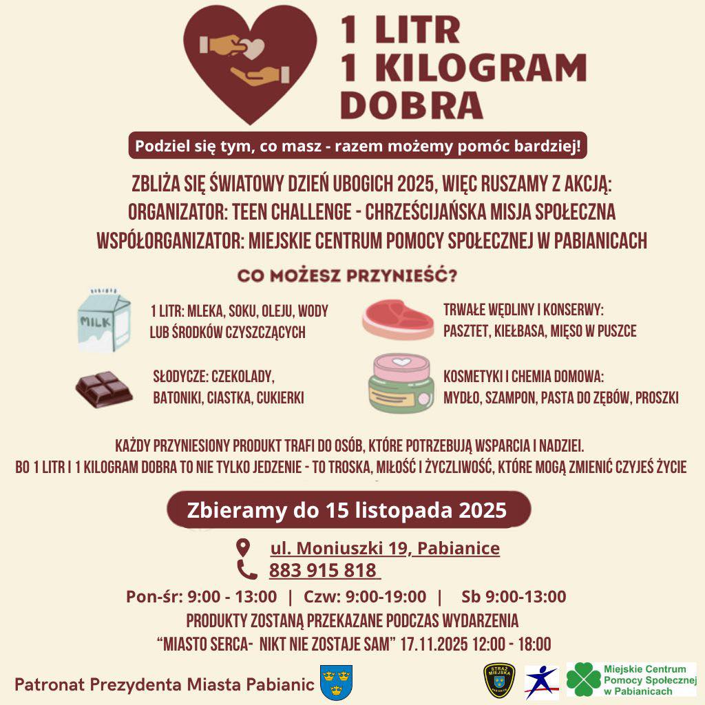 Organizatorzy przypominają, że 1 litr i 1 kilogram dobra to nie tylko jedzenie, ale także nadzieja i poczucie, że nikt nie jest sam. To prosty gest, który może realnie poprawić czyjś los.