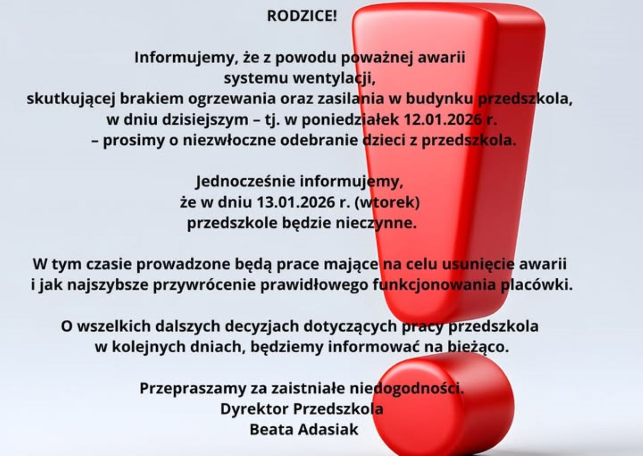 Pękła rura z zimną wodą w przedszkolu nr 16 przy ul. Bugaj. Placówka jest zamknięta, a zajęcia odwołane. Rodzice proszeni o odebranie dzieci i zorganizowanie opieki nad nimi. Nie wiadomo, jak długo potrwa ta sytuacja