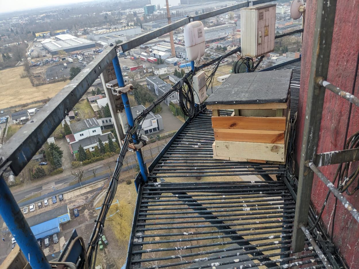 Przedstawiciele Stowarzyszenia w ubiegłym tygodniu byli w Pabianicach i zamontowali na galeryjce komina, na wysokości 80 metrów „budkę dla ptaków”. To drewniana konstrukcja wielkości 0,6 x 0,6 m , którą spece od prac na wysokościach, wciągnęli na linie na komin, a następnie wypełnili żwirem, bo sokoły nie potrzebują luksusów. Wystarczy im trochę żwirku, kamyków i małe zagłębienie w środku nich, by złożyć jaja i doczekać się młodych. Domek na galeryjce komina ma dodatkowe wyposażenie - daszek, który chroni przed deszczem i słońcem.