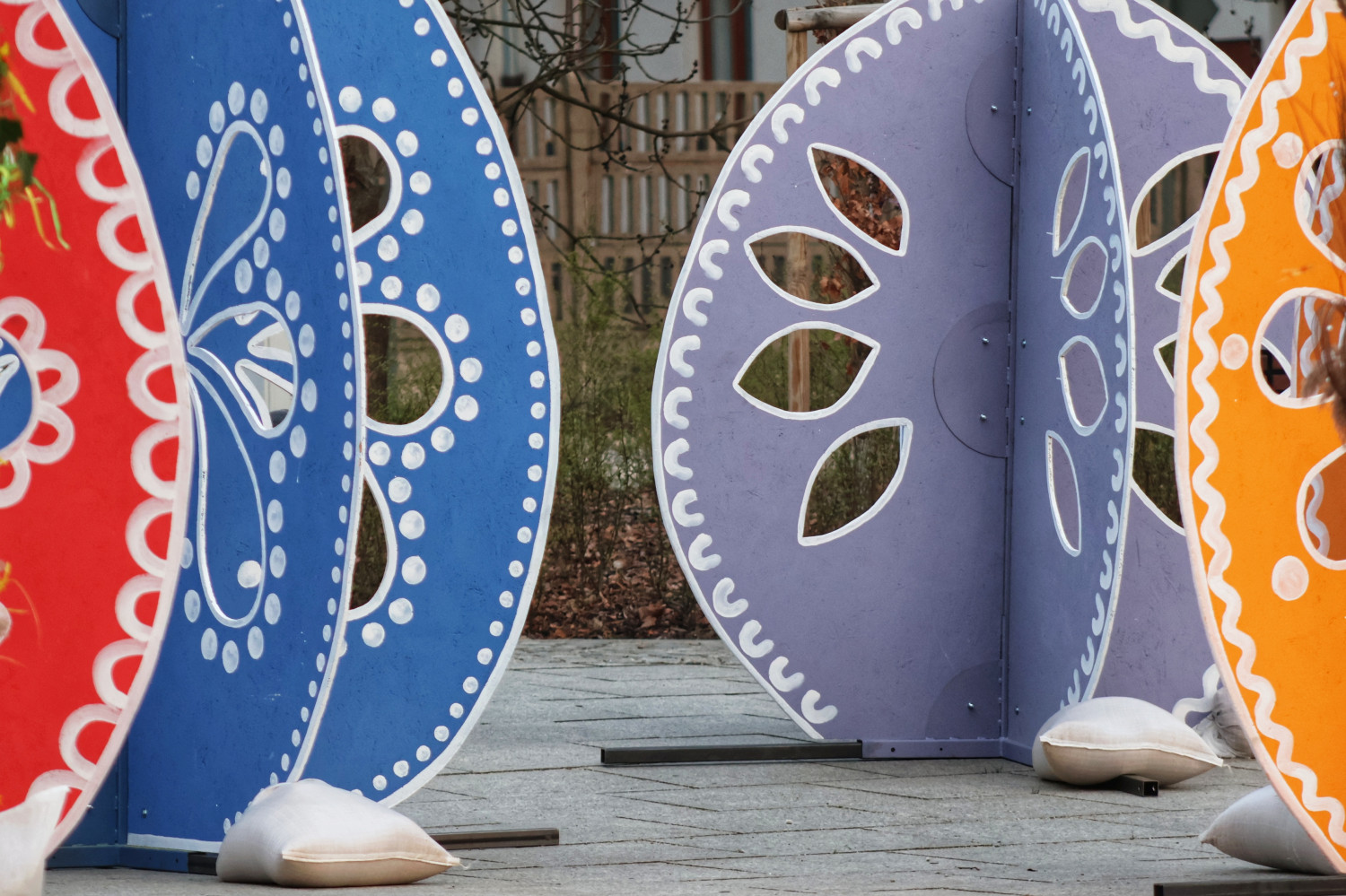 Na placu stanęły duże, barwnie zdobione pisanki.