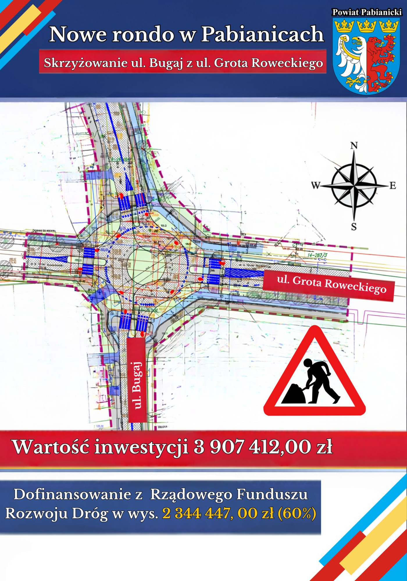 rozbudowę drogi powiatowej nr 3304E – ul. "Grota" Roweckiego wraz ze skrzyżowaniem z ul. Bugaj w Pabianicach. W tym miejscu powstanie rondo, które uporządkuje organizację ruchu i zwiększy bezpieczeństwo wszystkich uczestników ruchu drogowego. Całkowity koszt inwestycji wynosi 3 907 412,00 zł, z czego 2 344 447,00 zł stanowi dofinansowanie.