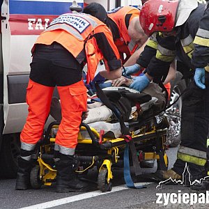 Potrąconego mężczyznę (82 lata) karetka pogotowia zabrała na oddział SOR w Pabianicach. Miał wstrząśnienie mózgu i uraz stawu skokowego. Lekarze utrzymywali go w śpiączce farmakologicznej.