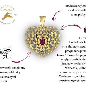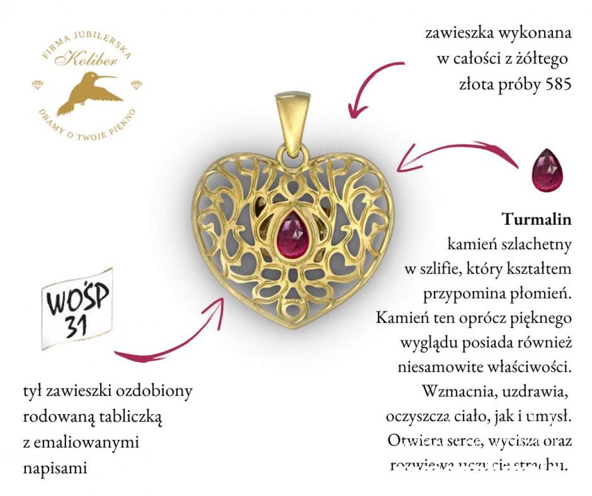 Do zdobycia będzie też zawieszka w kształcie serca, według projektu firmy jubilerskiej "Koliber". Biżuteria zrobiona jest z czystego złota próby 585, z kamieniem szlachetnym - turmalinem, który symbolizuje płomień. Nawiązuje do jednego z haseł tegorocznego finału - „Mam ogień w sercu”. Na odwrocie wisiorek posiada tabliczkę rodową. Biżuteria będzie licytowana podczas koncertu w "Zielonej Górce".