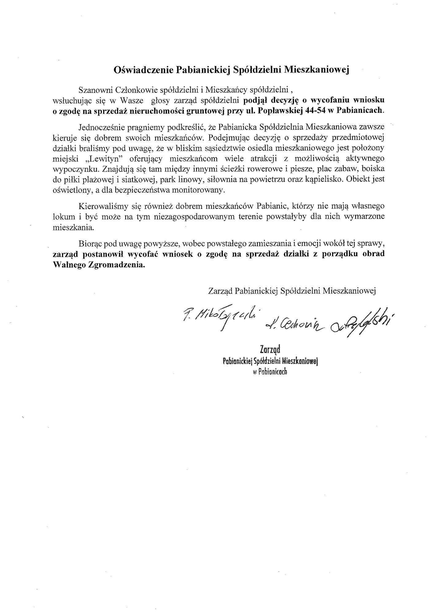 Mieszkańcy Pabianic, szczególnie ci z osiedla w okolicach ul. Popławskiej, skutecznie zaprotestowali przeciwko planowanej sprzedaży zielonego terenu. Po nagłośnieniu sprawy w mediach (o Walnym Zgromadzeniu pisaliśmy 14 maja TUTAJ), m.in. dzięki planowanej wizycie telewizji i mobilizacji społeczności, władze spółdzielni zdecydowały się wycofać punkt o sprzedaży działki z porządku obrad.