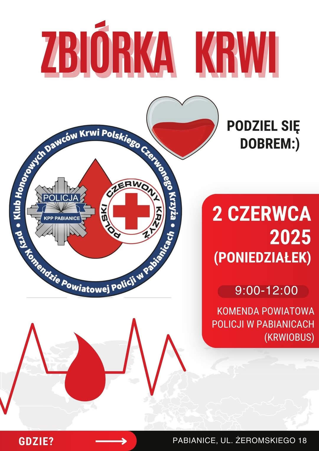 W poniedziałek, 2 czerwca, mieszkańcy Pabianic będą mogli pomóc potrzebującym – rusza pierwsza zbiórka krwi organizowana przed Komendą Powiatową Policji przy ul. Żeromskiego 18. W godzinach 9:00–12:00 na wszystkich chętnych będzie czekał krwiobus Regionalnego Centrum Krwiodawstwa i Krwiolecznictwa.
