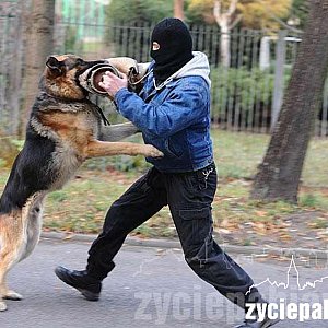 - Nawet w kagańcu policyjny pies może nieźle poturbować – ostrzega sierżant Witold Mękarski, przewodnik Jacka. – Wszak waży czterdzieści kilogramów. Rozpędzony wilczur potrafi przewrócić potężnego chłopa.