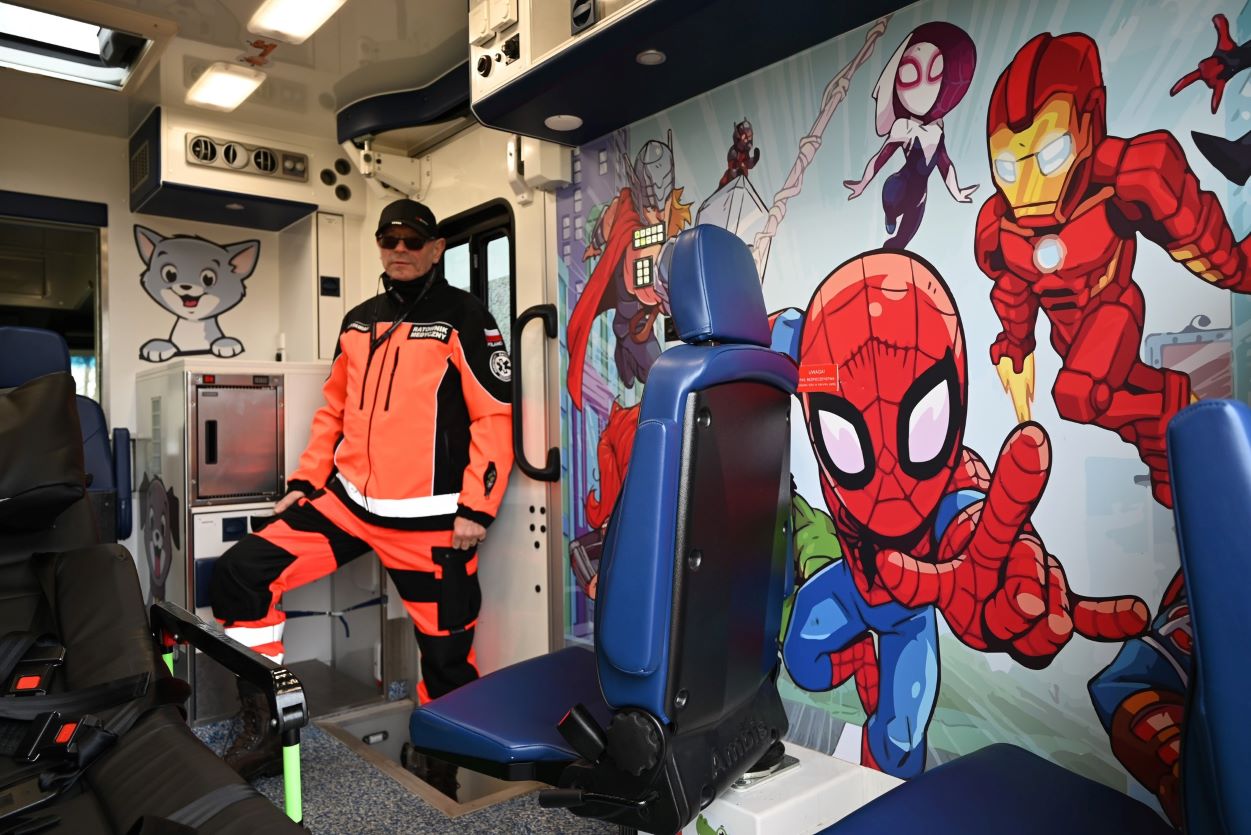 Ponieważ pojazd powstał z myślą o transporcie dzieci, a przecież są one pacjentami naszego szpitala, wnętrze jest bardzo kolorowe – zdobią je postacie z bajek i kreskówek.