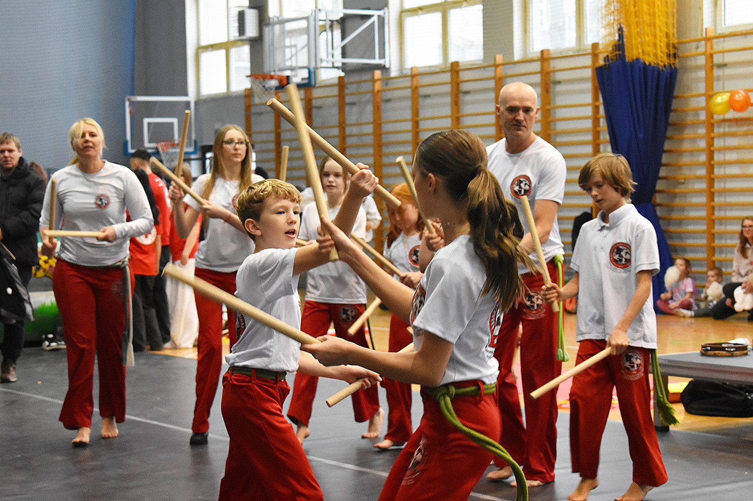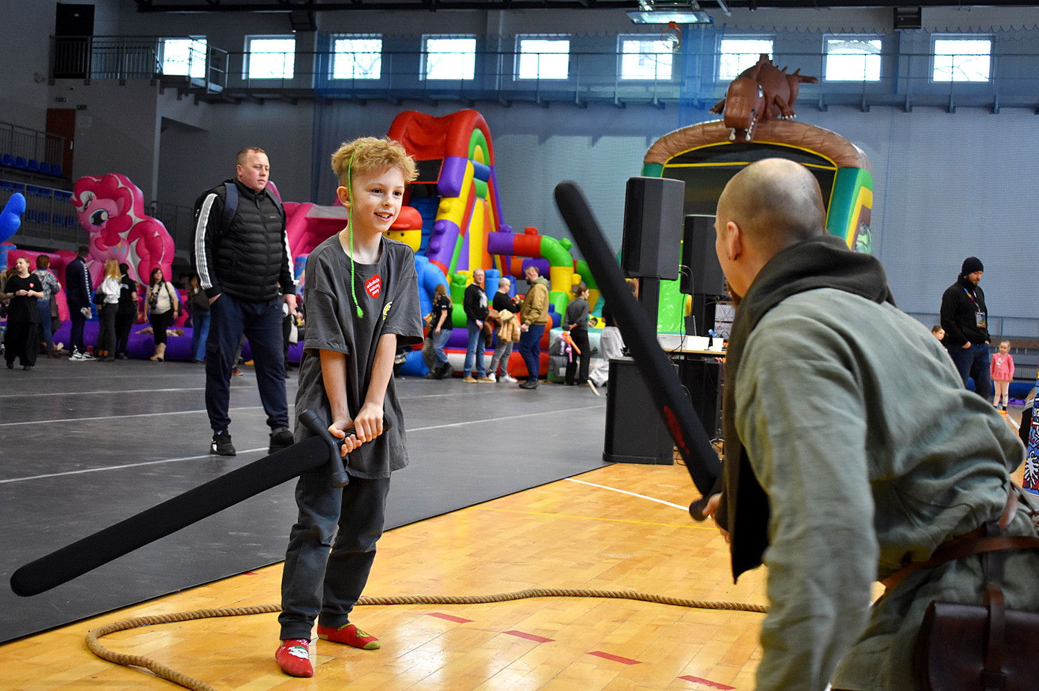 W Powiatowej Hali Sportowej rządziły dzieci. Festyn „Dzieci Dzieciom” to był klasyczny miks wszystkiego, co najlepsze: dmuchańce, animacje, tańce, fotobudka, capoeira i walki na miecze, w których chętnie brali udział także… dorośli. Była też nauka pierwszej pomocy, bo przy całej tej zabawie WOŚP zawsze przypomina, po co gramy.