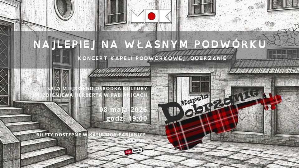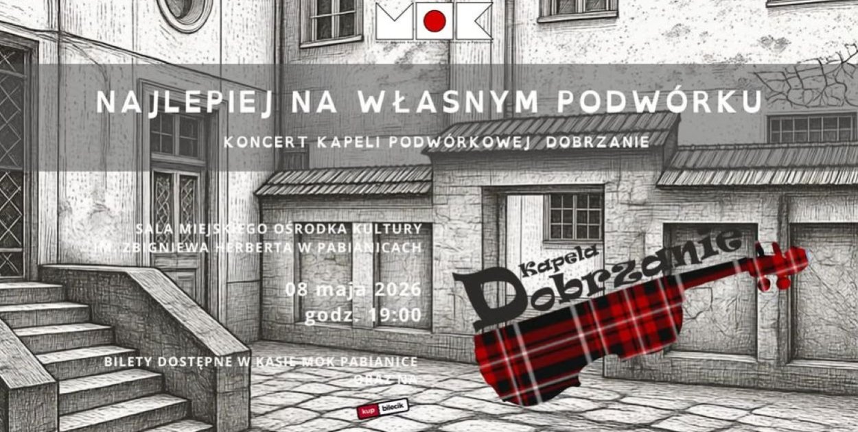 Miejski Ośrodek Kultury w Pabianicach zaprasza 8 maja na wyjątkowy koncert kapeli „Dobrzanie” zatytułowany „Najlepiej na własnym podwórku”. Wydarzenie stanowi muzyczny powrót do korzeni zespołu i repertuaru, od którego rozpoczęła się ich artystyczna droga.