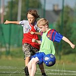 Drużyna Smerfów (niebieskie koszulki) wygrała eliminacje miejskie w grupie 9-11 lat.