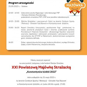 Po części oficjalnej, która rozpocznie się o godz. 15.00, wręczeniu awansów, dyplomów i odznaczeń, przekazaniu i poświęceniu nowych samochodów dla KP PSP w Pabianicach rozpocznie się pokaz ratownictwa technicznego (godz. 16.30). Będą konkursy dla dzieci i występ Orkiestry Dętej z Górki Pabianickiej (godz. 17.30). Na koniec zaplanowana jest strażacka biesiada.
