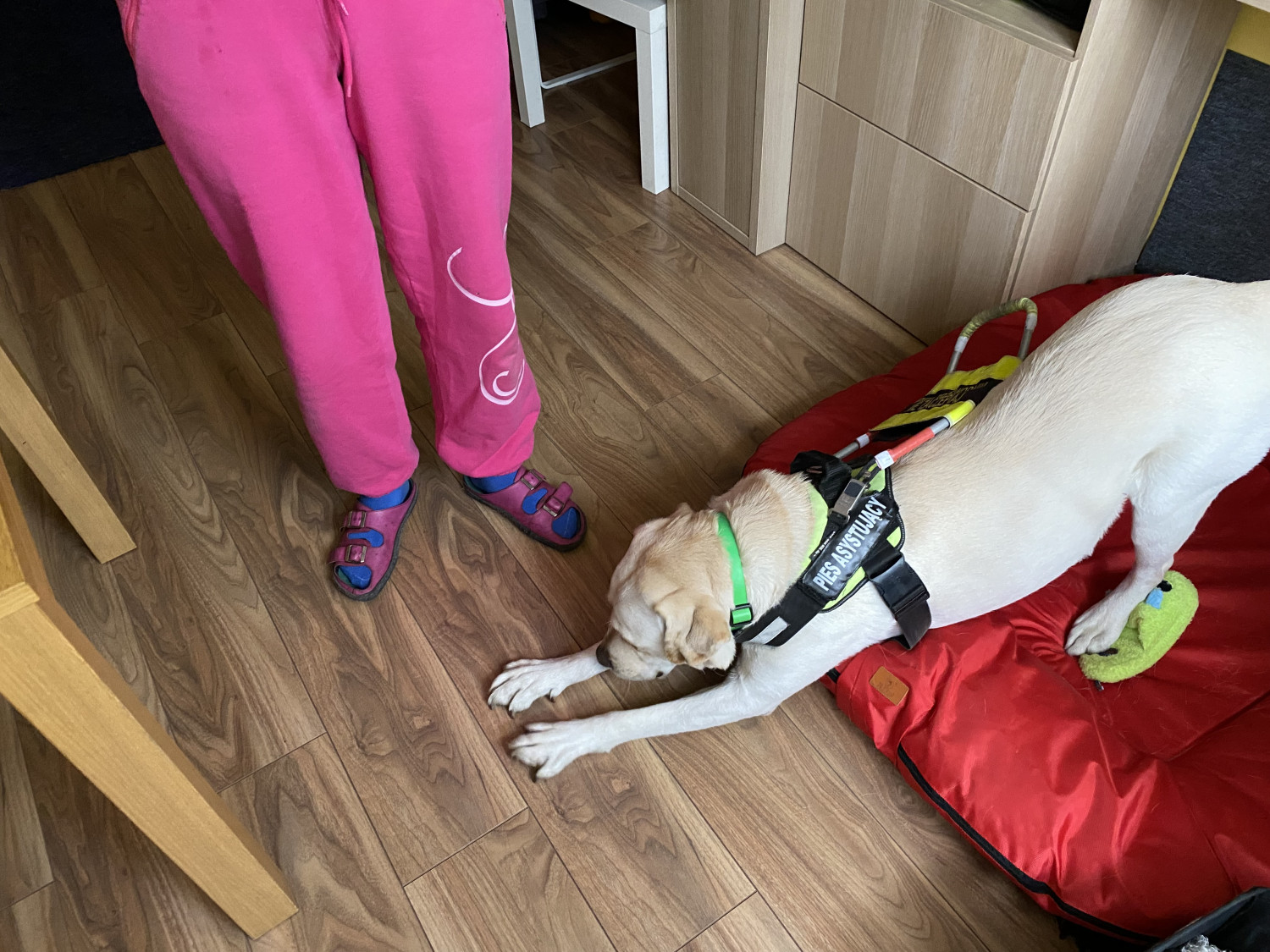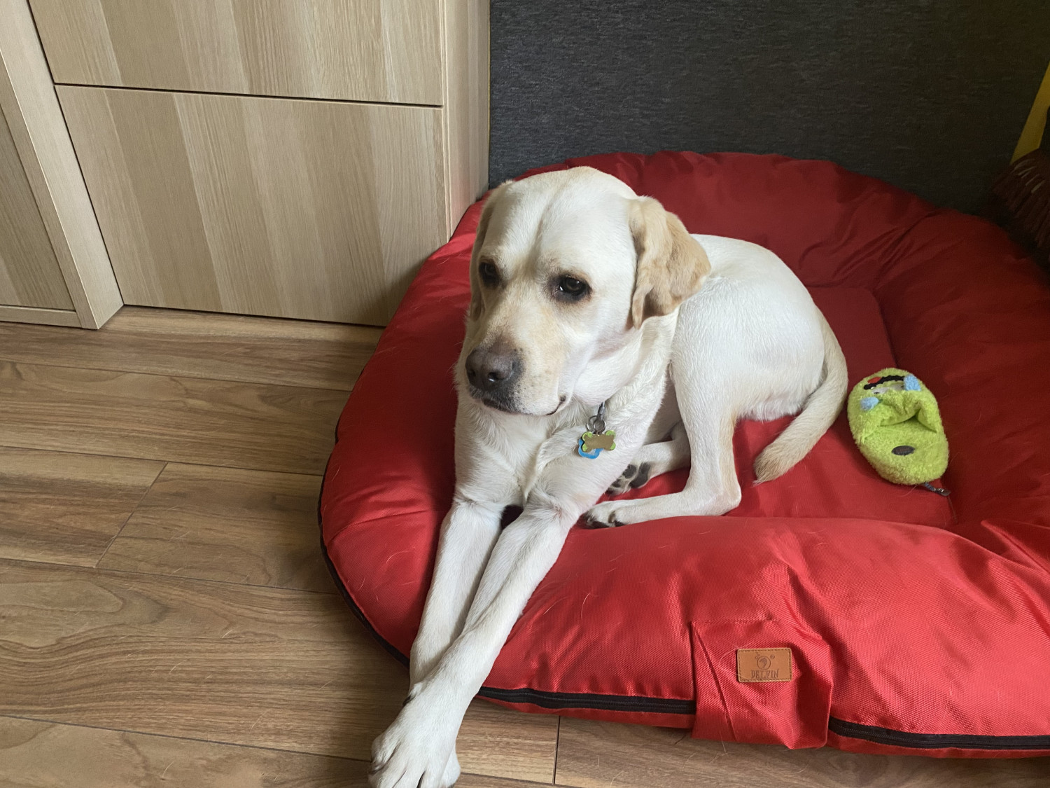 W niewielkim mieszkaniu Marty, labrador ma swój „kawałek podłogi” a na nim piękny czerwony materac. Obok stoi pudło pełne jego zabawek: pluszaków, piłek, gumowych piszczących. Te ostatnie lubi najbardziej.