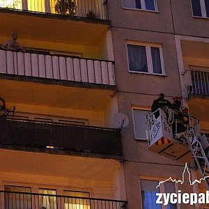 Strażacy rozstawili przed blokiem od strony balkonu skokochron. Policjanci w tym czasie próbowali rozmówić się z sąsiadami.
