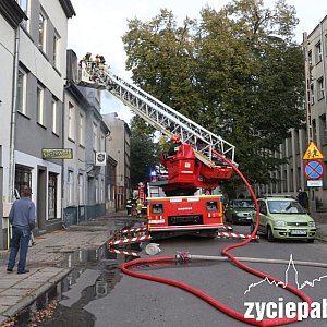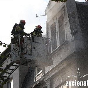 Strażacy, za pomocą drabiny mechanicznej, wspięli się na wysokość płonącego poddasza. Ogień wydobywał się przez okno.