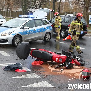 Do poważnej stłuczki doszło dziś po godzinie 13.00. Kierowca wyjeżdżający kią z ul. Barucha nie przepuścił motocyklisty jadącego ul. Partyzancką (w kierunku św. Jana). W wyniku zderzenia i upadku na jezdnię motocyklista doznał min. urazu kręgosłupa. Ratownicy medyczni przewieźli poszkodowanego do szpitala im. Kopernika.