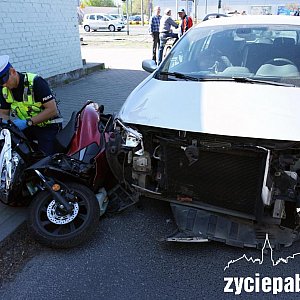 Mężczyzna jechał hondą ul. Łaską, w kierunku Zamkowej. Gdy był na wysokości Lidla, drogę zajechała mu osobówka wyjeżdżająca z parkingu marketu.