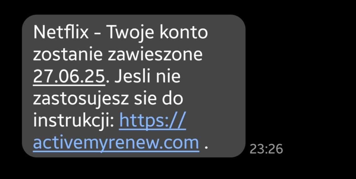 „Netflix – Twoje konto zostanie zawieszone 27.06.25. Jesli nie zastosujesz sie do instrukcji: TU ADRES STRONY INTERNETOWEJ"