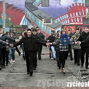 Jako pierwsza na placu przed ratuszem wystąpiła młodzież z Gimnazjum nr 3. 16 par tańczyło przy dźwiękach utworu skomponowanego przez Wojciecha Kilara do filmu "Pan Tadeusz".