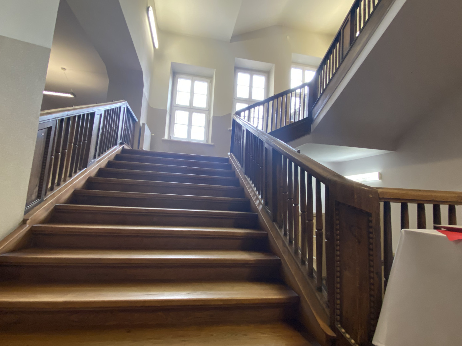 Po półoficjalnej uroczystości był poczęstunek i rozmowy przy stolikach na szkolnym korytarzu. Były też pamiątkowe zdjęcia na słynnych schodach.