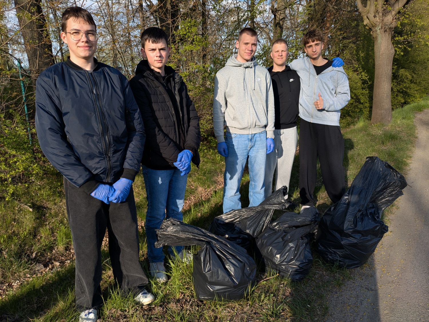 Po części „zielonej” przyszedł czas na mniej przyjemną rzeczywistość. Grupa wolontariuszy ruszyła w stronę drogi prowadzącej do szkoły, by sprawdzić, co kryje się w rowach i pod krzewami. Wystarczyło około 35 minut spaceru, by zebrać worki pełne odpadów, od szklanych butelek, przez puszki, po plastikowe opakowania.