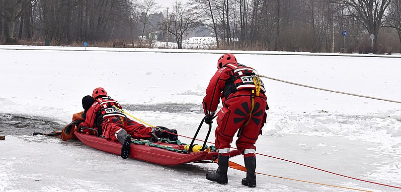 Kruchy lód, lodowata woda i sekundy, które decydują o wszystkim. Tak wyglądał coroczny zimowy pokaz ratownictwa, zorganizowany przez Komendę Powiatową Państwowej Straży Pożarnej w Pabianicach oraz Komendę Powiatową Policji w Pabianicach